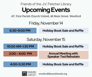 Join the Friends of the J.V. Fletcher Library for this exciting event at First Parish Church United!The Holiday Book Sale will include holiday-themed items, gift-quality items, and blind date with a book or puzzle.
