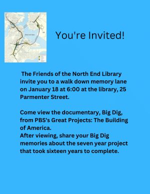 Join us at the North End Library, 25 Parmenter Street, on Wednesday, January 18, 2023 at 6:00 PM to watch a PBS documentary detailing the trials and successes of the planning and construction of Boston’s famous “Big Dig”, the most expensive public construction project up to that time.The Big Dig involved demolition of the elevated highway which separated the Boston Waterfront and the North End from the rest of the City and replaced it with an underground roadway and a linear nature park and walkways, known as the “Greenway”.