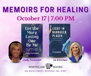 It's an evening of memoirs at Whitelam Books on October 17th!Judy Foreman and Liz Kinchen (authors of new books Let the More Loving One Be Me and Light in Bandaged Places) will be in conversation at Whitelam Books on Tuesday, Oct. 17 at 7 PM.