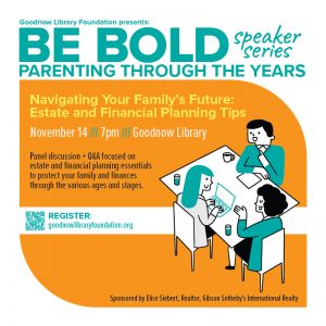 Goodnow Library Foundation's Be Bold Speaker Series: Parenting Through the Years Navigating Your Family’s Future: Estate and Financial Planning Tips for Parents November 14 at 7pmDive into what you need to know about estate and financial planning to best support your family.