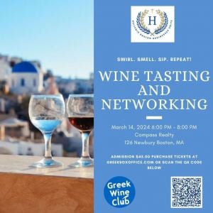 Hellenic Boston Businesses Unite and The Greek Wine Club are teaming up to host a Wine Tasting & Networking event on Thursday, March 14 from 6-8pm at Compass Realty (126 Newbury Street, 2nd Floor, Boston, MA, 02116).For $45/ticket via Greek Event Box Office, guests are invited to enjoy an evening of discovering new wines from Greece while mingling and networking accompanied by light snacks.