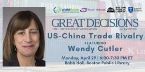 The program will feature an expert discussion between Wendy Cutler and WorldBoston Board member Leslie Griffin, live audience Q&A, and time for networking and discussion with other globally-oriented participants in the Newsfeed Café.