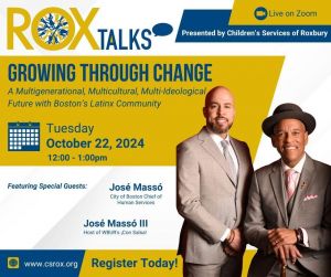 Register today to reserve your spot for the first edition of Children's Services of Roxbury's (CSR) newest season of 'ROXTalks.''Growing Through Change: A Multigenerational, Multicultural, Multi-Ideological Future with Boston’s Latinx Community,' will feature special guests José Massó III, Host of WBUR's ¡Con Salsa!