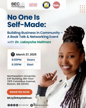 Join us for 'No One Is Self-Made: Building Business in Community – A Book Talk & Networking Event with Dr. Lakeysha Hallmon,' presented by BECMA, Black Owned Bos., and Northeastern University’s Women Who Empower.Dr. Lakeysha Hallmon, affectionately known as Dr. Key, is a visionary entrepreneur and founder of The Village Market, which has generated over $8.8 million in direct sales for Black-owned businesses.