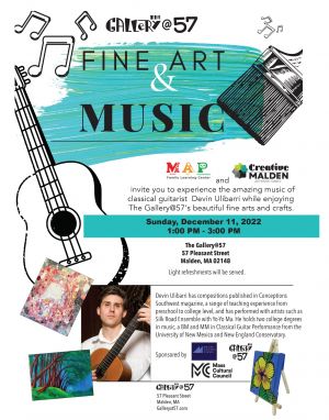 MAP Family Learning Center and Creative Malden invite you to experience the amazing music of classical guitarist Devin Ulibarri while enjoying The Gallery@57's beautiful fine art and crafts.Devin Ulibarri has compositions published in Conceptions Southwest magazine, a range of teaching experience from preschool to college level, and has performed with artists such as Silk Road Ensemble with Yo-Yo Ma.