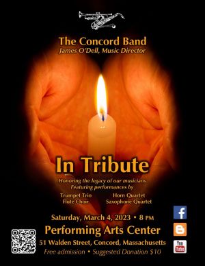 The Concord Band’s Winter Concert will be Saturday, March 4 at 8:00 pm at the 51 Walden Performing Arts Center in Concord under the direction of Music Director James O’Dell.The concert, entitled “In Tribute,” will be a memorial concert to honor Concord Band members whose musical legacy lives on in the hearts of the Band and the community.