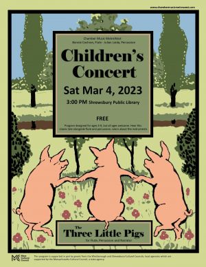 Chamber music MetroWest presents The Three Little Pigs Children’s Concert with Bonnie Cochran, flute, and Julian Loida, percussionA musical rendition of the Three Little Pigs for Flute and Percussion.