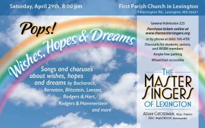 Please join the Master Singers of Lexington on Saturday April 29th, at 8:00 pm for their annual Pops concert entitled, “Pops!Wishes, Hopes, and Dreams.” This concert will feature songs and choruses about wishes, hopes, and dreams, and will include music by Burt Bacharach, Leonard Bernstein, Frank Loesser, Rodgers & Hart, Rodgers & Hammerstein, and more!