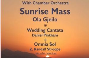 Centered around Norwegian composer Ola Gjeilo's symphonic Sunrise Mass for double chorus (2008), our program will appeal to everyone who enjoys accessible, joyful choral music, lush harmonies and inspiring text-setting.Other selections include Daniel Pinkham's Wedding Cantata, Z.Randall Stroope's Omnia Sol, and a set of songs performed by the outstanding young musicians of the CRLS Traveling Chorus, fresh from their recent appearance at Carnegie Hall.