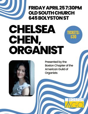 Chelsea Chen will perform at Old South Church, Boston.Her concerts offer a unique mix of organ repertoire alongside transcriptions and contemporary music.