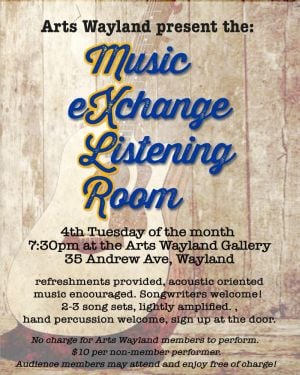 The Music Exchange Listening Room has a new home!We are pleased to report that we are returning to the Arts Wayland Gallery, 35 Andrew Ave, Wayland, where creative music will once again mix with the many visual displays of artistry.