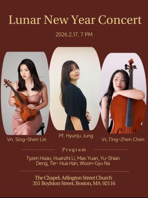 Boston based pianist Hyunju Jung, who earned her Doctor of Musical Arts in Piano Performance from Boston University, violinist Sing-Shen Lin, and cellist Ting-Zhen Chen will present a special performance titled “Lunar New Year Concert.” This concert brings together traditional melodies from Korea, Taiwan, and China, reimagined through a contemporary classical lens.The program features trio arrangements inspired by traditional music, including the beloved Korean folk song Arirang, with the aim of sharing the joy and hope of the new year with the audience.