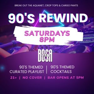 Step back in time at 90’s REWIND Saturdays, where BOSA Skies’ tenth-floor rooftop transforms into the ultimate '90s party!Jam to iconic hits from *NSYNC, Backstreet Boys, TLC, and Destiny’s Child while sipping on nostalgic '90s-themed cocktails like “Hit Me Baby One More Lime” and “Fresh Sip of Bel-Air.”