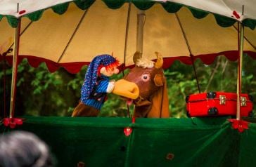 Join the German hand puppet hero Kasper on two imaginative adventure stories that come to life on a whimsical puppet stage made out of a giant umbrella! When Kasper’s best friend, the endearing giant Augustine, wins an airplane in a sweepstakes, Kasper accidentally flies off!Luckily, Grandma and her clothesline come to the rescue. In the second story, Kasper’s efforts to go on a journey are flustered by a comical cow who steals his suitcase and sends Kasper and his friends on a rollicking chase.