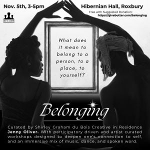 Since the beginning of the COVID-19 global pandemic, 2023-2024 Shirley Graham du Bois Creative in Residence Jenny Oliver‘s work has centered on the questions of “What does it mean to belong to a person, to a place, to yourself?” During this time, artists – more broadly – have also been moving through various stages of creativity and tectonic shifts as they interpret their connection to the topic.Join us at 3:00PM for participatory, artist curated workshops designed to deepen one’s connection to self, followed at 4:00PM by an immersive mix of music, dance, and spoken word performances.