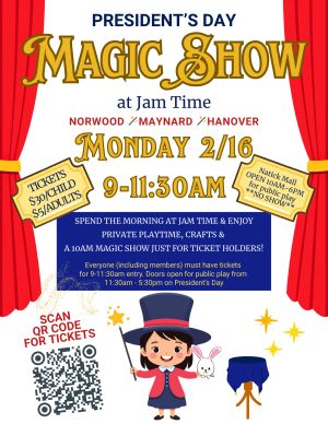 Join us at Jam Time this Presidents Day for a Magic Show, crafts, and exclusive playtime just for ticket holders!Doors open at 9am for playtime and crafts before the 10am Magic Show!
