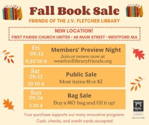 NOTE: This sale will take place in a new location — First Parish Church United, 48 Main Street — since the library is under construction.Thousands of great books, DVDs, and audio to choose from.