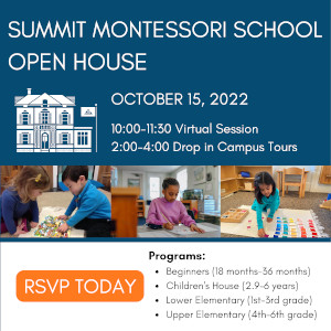 Summit Montessori School, a 'small by design' Montessori school in Framingham, MA serving children ages 18 months through twelve years, is offering a virtual open house on Saturday, October 15th, 2022 from 10:00 AM - 11:30 AM.Join us to learn about the plane of development your child will enter, understand the goals of our programs, walk through a day in the life of a Summit student, chat with current parents, learn about the Montessori philosophy, and receive information on the admissions process.
