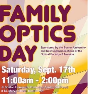 Boston University and the Optical Society of America host a Family Optics Day with demonstrations of optics and hands-on activities for future scientists and engineers. On the 9th Floor BU Photonics Center (8 St. Mary’s Street, Boston.)Family Optics Day is an educational event to expose kids (of all ages) to the fascinating area of optics. Structured like a science fair, there will be separate tables, each presenting a demonstration on different aspects of optics.
