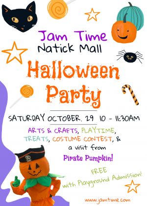 Put on your Halloween costumes and head to Jam Time inside the Natick Mall for a spooktacular Halloween Party with Pirate Pumpkin!We'll have Halloween arts & crafts in the party room, lots of playtime, yummy treats and fun with Pirate Pumpkin!