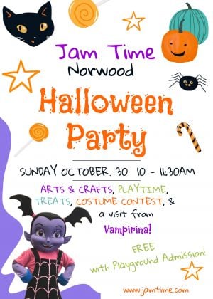Put on your Halloween costumes and head to Jam Time in Norwood for a spooktacular Halloween Party with Vampirina!We'll have Halloween arts & crafts in the party room, lots of playtime, yummy treats and fun with Vampirina!