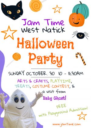 Put on your Halloween costumes and head to Jam Time in West Natick for a spooktacular Halloween Party with Baby Ghost!We'll have Halloween arts & crafts in the party room, lots of playtime, yummy treats and fun with Baby Ghost!