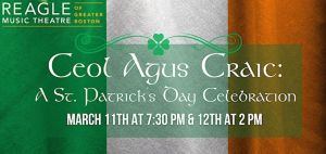 Reagle Music Theatre's Ceol Agus Craic: A St. Patrick's Day Celebration will bring you all the luck you need this holiday!Starring the talents of Broadway's CiarĂ¡n Sheehan and his critically acclaimed musicians and friends from Galway and beyond, this concert will lift your spirits and have you humming along to your favorite tunes such as 'The Wild Rover,' 'Danny Boy', 'Galway Bay,' and 'Too Ra Loo Ra.'