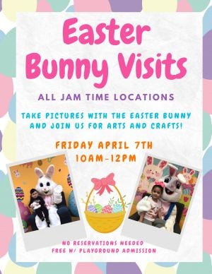 Hop on down to Jam Time and enjoy a cheerful spring morning of play time with arts and crafts!Then meet the bunny of the hour, the Easter Bunny!