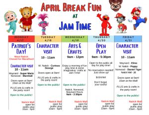 Come spend your Patriot's Day playing at Jam Time and meet Super Mario in Maynard or Marshall in Norwood!(West Natick closed for marathon) Character visits from 10:00 am – 11:00 am.
