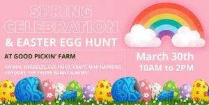 Join us on March 30th to celebrate Spring at Good Pickin' Farm!Partake in an Easter Egg Hunt, Snuggle Animals, Meet the Easter Bunny and so much more!