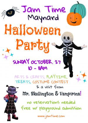 Celebrate Halloween at Jam Time with private play, crafts, treats, and a monster meet & greet! Kids also get to adopt a plush monster to take home.Maynard, Norwood & Hanover: Doors open 9:00–11:30am (party festivities 10:00–11:30am)