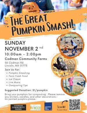 Join us for a smashing good time at the 5th Annual Great Pumpkin Smash at Codman Community Farms!This family-friendly event is all about having fun while also making a positive impact on our planet.