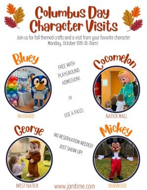 Spend your Columbus Day holiday playing at Jam Time and meet your favorite character!Doors open at 9am with a character visit from 10-11am.