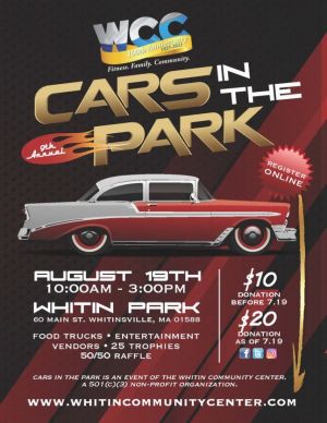 The Whitin Community Center’s 9th Annual Cars In The Park (CITP) will be held on Saturday, August 19, 2023 from 10am-3pm, in our beautiful 7.5 acre Whitin Park, 60 Main Street in Whitinsville MA.Cars In The Park is a car, truck & motorcycle show with Best In Show, 25 Trophies, Door Prizes, Show Dash Plaques & Goodie Bags (for the first 50 pre-registered vehicles), Food Trucks, Event Vendors, Kids Activities, 50/50 & Raffles, Entertainment and more!