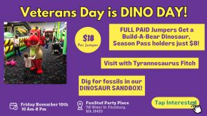 Join us for Dino Day on Veterans Day, Friday, Nov 10th, from 10:00 am to 8:00 pm at FunStuf Party Place!Parents of kids ages 4-12, get ready for a prehistoric adventure.