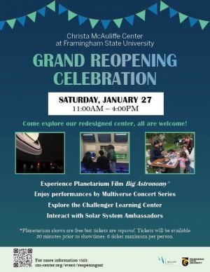 Come explore the Christa McAuliffe Center's redesigned center, all are welcome!Experience Planetarium Film 'Big Astronomy'*, enjoy performances by Multiverse Concert Series, explore the Challenger Learning Center and interact with Solar System Ambassadors.