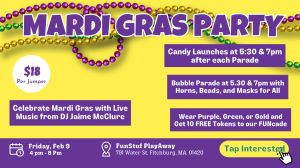 Get ready to party, FunStuf fam, we've got another one!Join us at FunStuf PlayAway for an EPIC Mardi Gras Bash on Friday, Feb 9, from 4:00 pm to 8:00 pm!