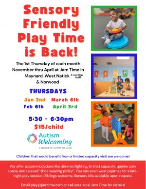 Jam Time is a newly certified Autism Welcoming business with a dedicated monthly hour of play with a sensory-sensitive environment.During this hour of play we offer dimmed lighting, limited capacity, lowered music volume, and a relaxed shoe wearing policy.