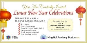 Boston Minghui School will celebrate the Chinese New Year at the Cambridge Main Library on the afternoon of February 1, 2025 (Saturday).