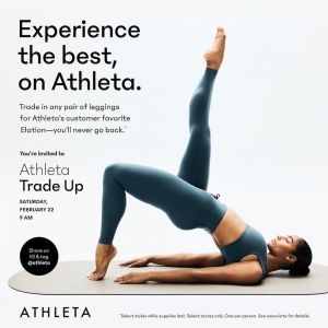 On Saturday February 22, Athleta will activate across 20 key retail doors for in-store trade-in events that will drive thousands of customers across the country to stores.For one day only, customers will be able to swap out any pair of leggings (no matter the brand) for a complimentary pair of Elation Ultra High-Rise Leggings, one of Athleta’s most popular and beloved styles!