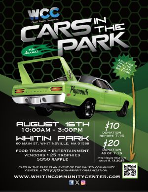 Cars in the Park is an auto show with Best In Show, 25 Trophies, Door Prizes, Show Dash Plaques & Goodie Bags (first 50 pre-registered vehicles), Food Trucks, Vendors, 50/50 Raffles, Entertainment, and more!The Whitin Community Center’s 2025 Cars In The Park (CITP) will be held on Saturday, August 16th from 10:00AM - 3:00PM in our beautiful 7.5 acre Whitin Park.