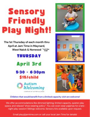 Jam Time is a newly certified Autism Welcoming business with a dedicated monthly hour of play with a sensory-sensitive environment.During this hour of play we offer dimmed lighting, limited capacity, lowered music volume, and a relaxed shoe wearing policy.