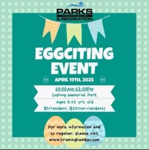 Help the Bunny find all of his eggs!Join the Parks & Recreation Department, Framingham Police Department, Framingham Fire Department, and the Library Bookmobile for a fun-filled event!