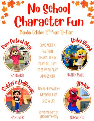 Spend this no school holiday at Jam Time for a morning of playtime and meeting your favorite character for photos and fun!No reservations needed, this character visit is free with normal playground admission!