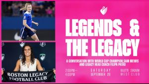 We can't wait to see you this Saturday, September 20 for Legends & The Legacy from 2:00-4:00 at Gillette Stadium.Join us in at Gillette Stadium's West Club to listen to a conversation with 2019 World Cup Champion, Sam Mewis and Legacy Head Coach, Filipa Patão.
