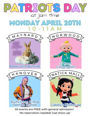 Everyone's favorite cat lover will be visiting Jam Time inside the Natick Mall this Patriot's Day!Gabby's Dollhouse will be visiting from 10:00-11:00am but doors are open for playtime from 10am-6pm.