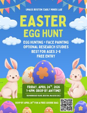 Families are invited to enjoy an afternoon of egg hunts, games, crafts, and prizes, along with optional opportunities to participate in fun, child-friendly research activities with the Early Minds Lab.