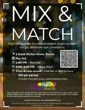 Mix & Match is a fun and supportive social event for neurodivergent singles to meet, mingle, and build meaningful connections in a relaxed, welcoming environment.Taking place on Sunday, May 3, 2026, at 4 South Market Street in Boston, the event begins at 2:00 PM with mini golf at Putt Across America, followed by a guided dating mixer from 3:00–4:30 PM at Ned Devine’s.