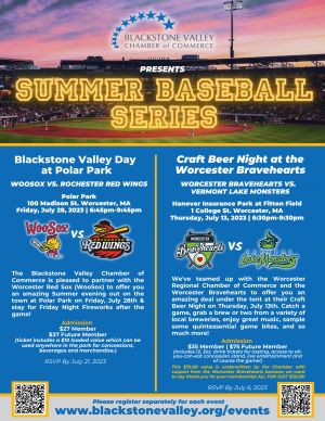 The Blackstone Valley Chamber of Commerce is pleased to partner with the Worcester Red Sox (WooSox) to offer you an amazing Summer evening out on the town at Polar Park on Friday, July 28th and stay for the Friday Night Fireworks after the game!