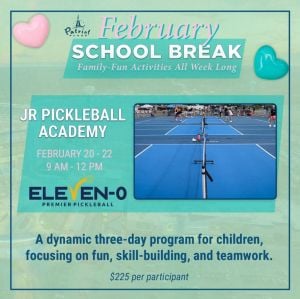 Patriot Place will feature a full slate of family-friendly activities and giveaways for February school vacation week, welcoming guests for daily festivities from Saturday, Feb. 17 through Saturday, Feb. 24.📍February School Break - ELEVEN-0 JUnior Pickleball Academy